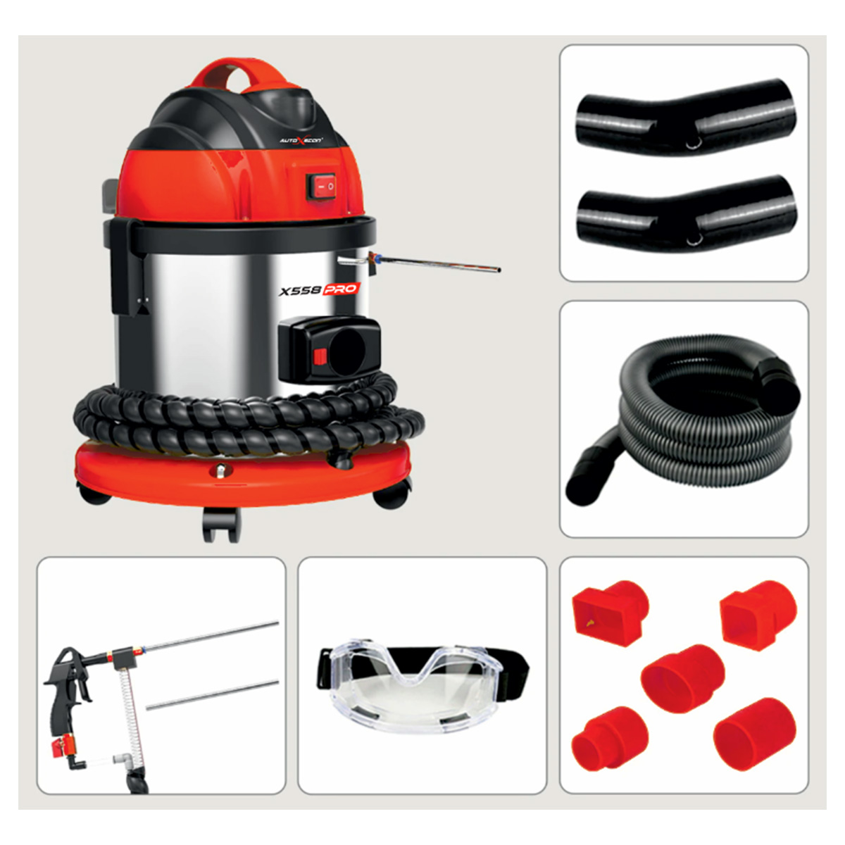 X558 PRO jest to maszyna do dekarbonizacji proszkiem orzechowym. Proszek jest wtryskiwany do rury wlotowej silnika przez przepływ powietrza pod wysokim ciśnieniem, który będzie się toczył i zderzał w zamkniętej rurze dolotowej, oczyszczając w ten sposób osad węgla na zaworze dolotowym i ściankach cylindra. Następnie mieszanina proszku orzechowego i osadu węglowego jest zasysana do pojemnika na pył przez specjalne złącze.