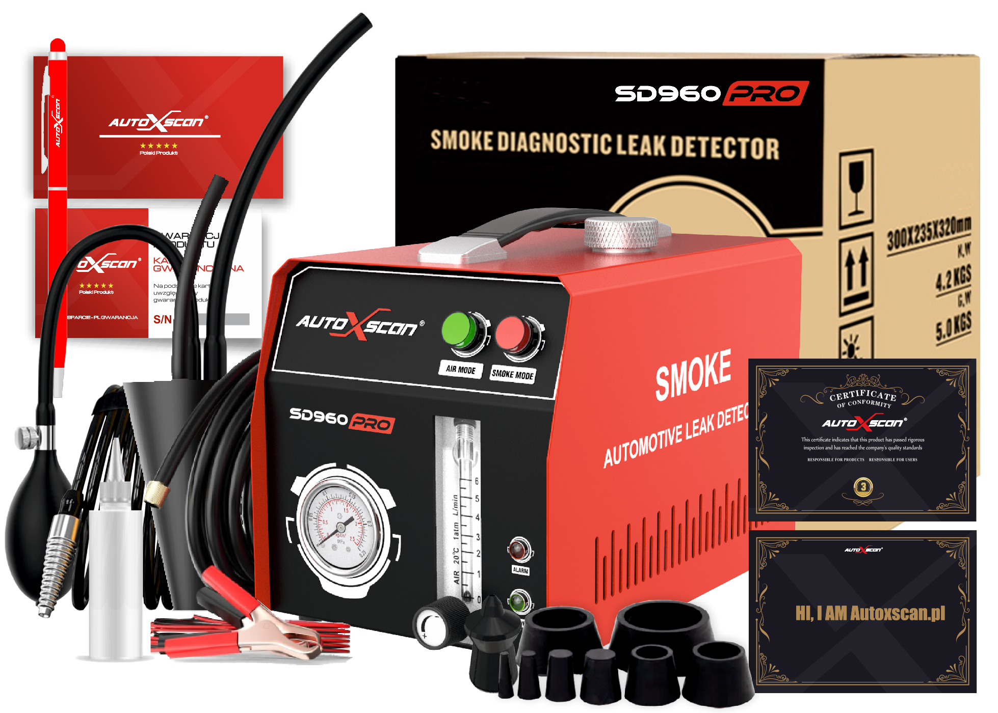 Ulepszony wykrywacz wycieków dymu samochodowego, profesjonalne narzędzie do automatycznego wykrywania nieszczelności rur. Pomoże nam to szybko i dokładnie zlokalizować wycieki w motocyklach i samochodach na systemach rurowych, takich jak test układu dolotowego, test układu wydechowego, test układu skrzyni korbowej, test uszczelnienia samochodu, test układu zbiornika paliwa, test systemu turbo, test różnych łączników rur.