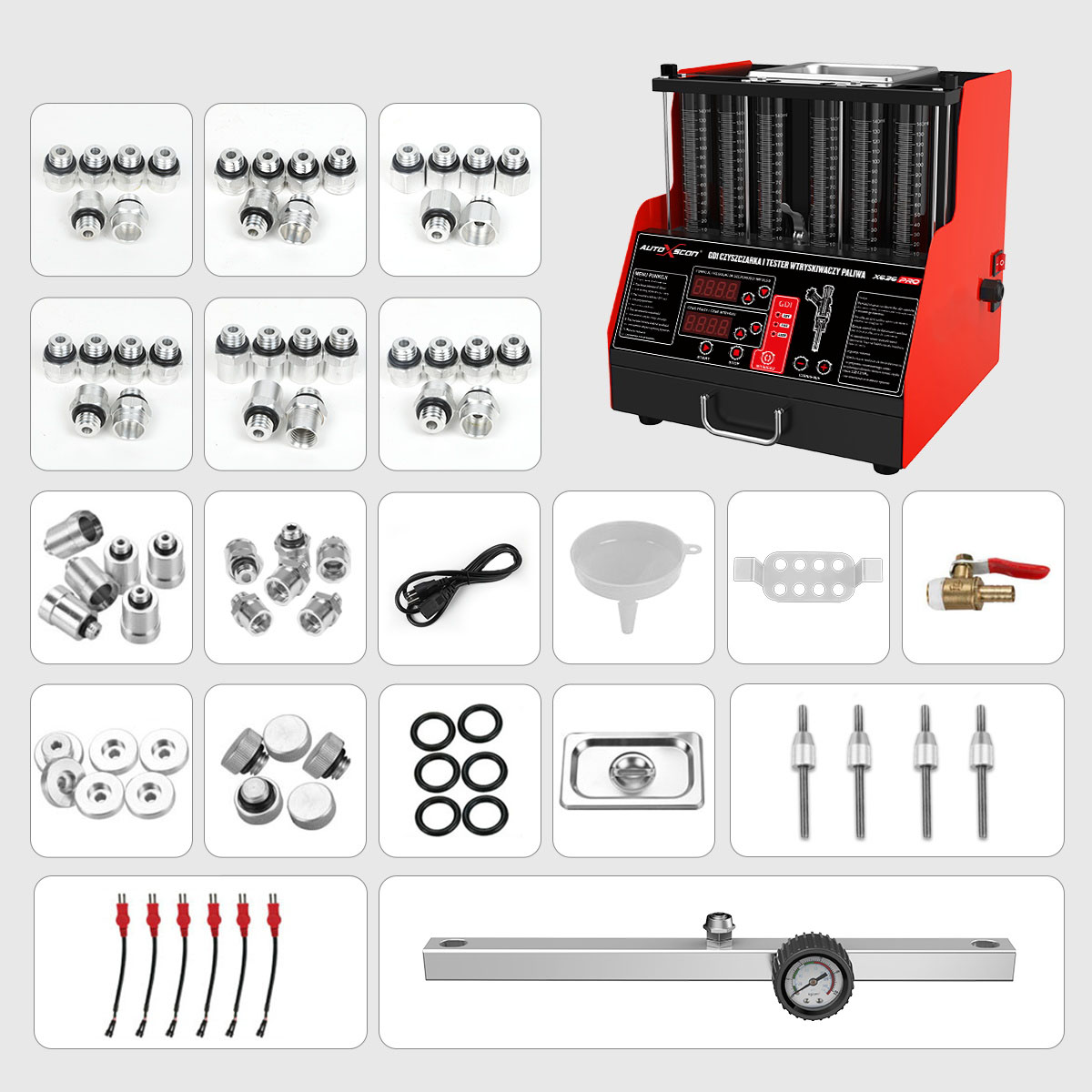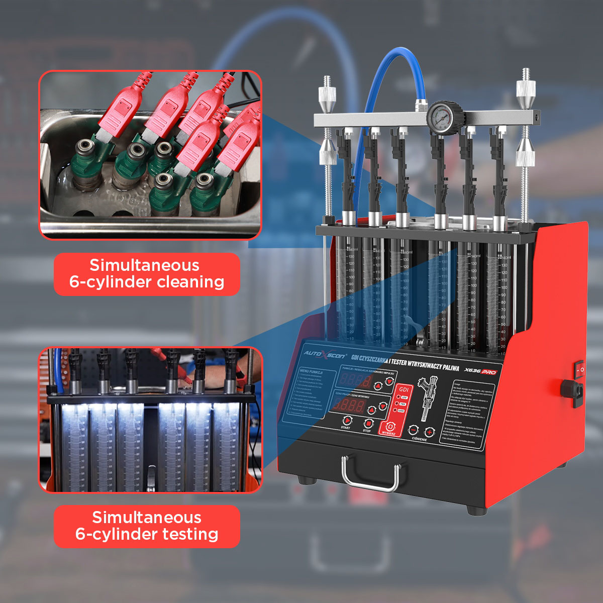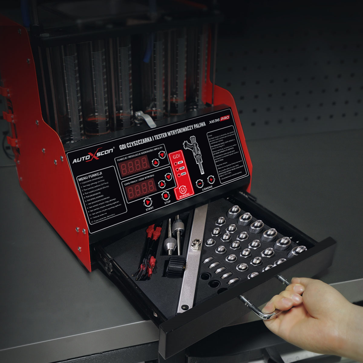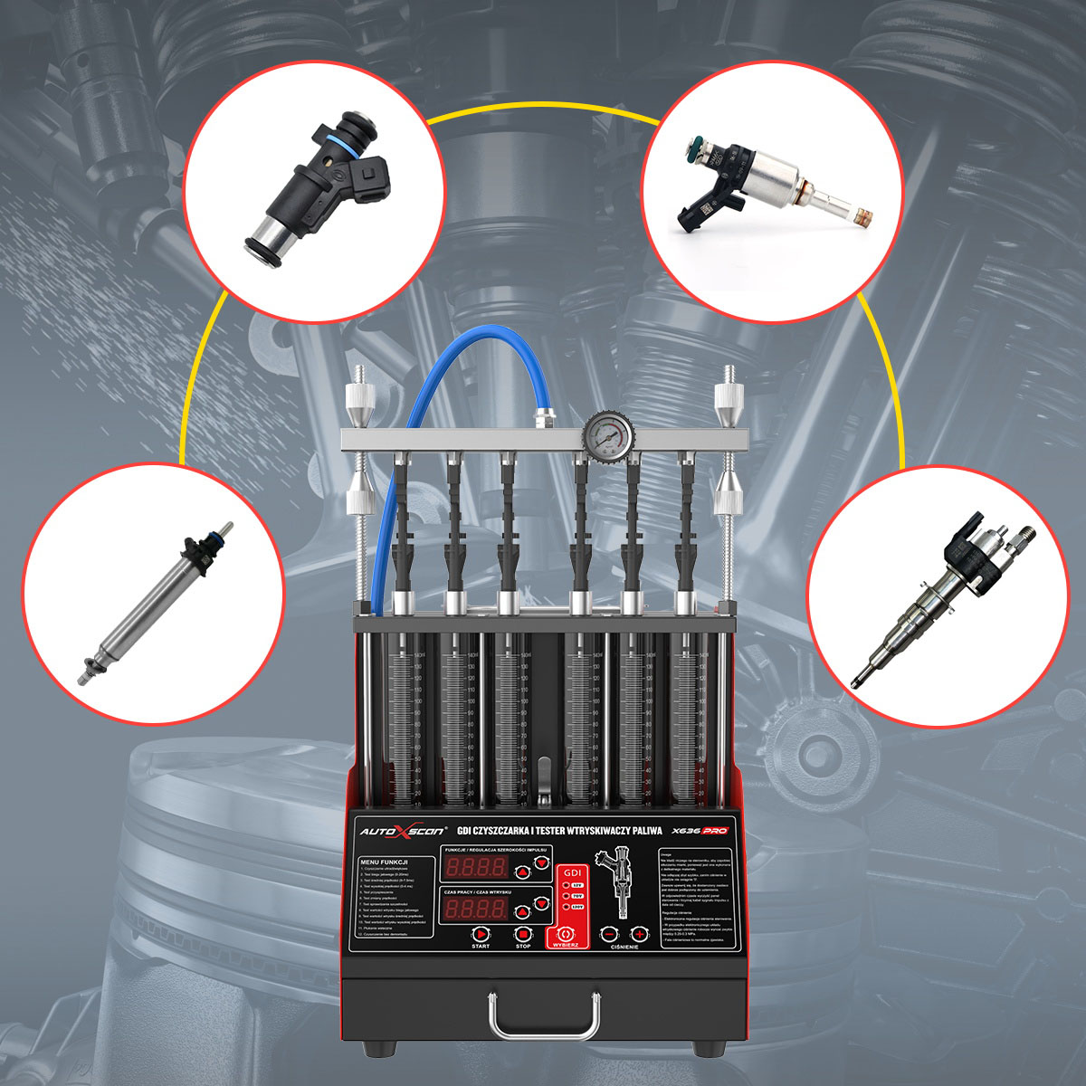 Czyszczarka wtryskiwaczy GDI, narzędzie diagnostyczne. Gama środków do czyszczenia wtryskiwaczy samochodowych autoXscan obejmuje testy wtryskiwaczy niskociśnieniowych, a także testy wtryskiwaczy wysokociśnieniowych, które są szeroko stosowane w GDI, EFI, FSI i innych typach wtryskiwaczy do samochodów, motocykli i jachtów.
