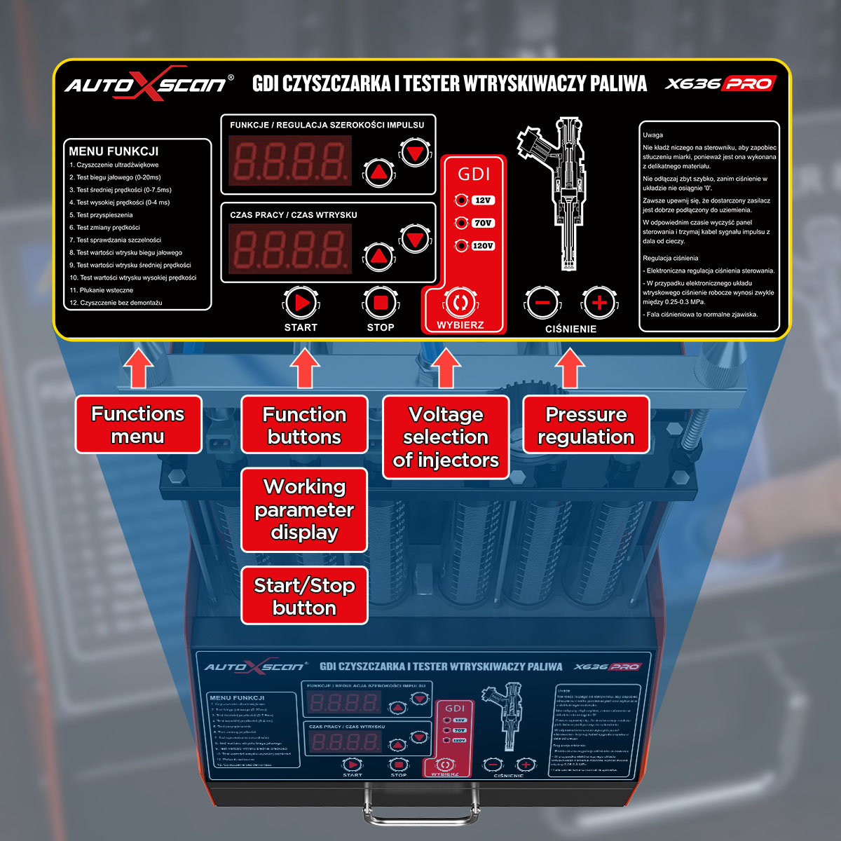 Obsługuje GDI, EFI, FSI i inne typy wtryskiwaczy paliwa, a także obsługuje zwykłe wtryskiwacze paliwa. Urządzenie obsługuje napięcie zasilania 110V/220V