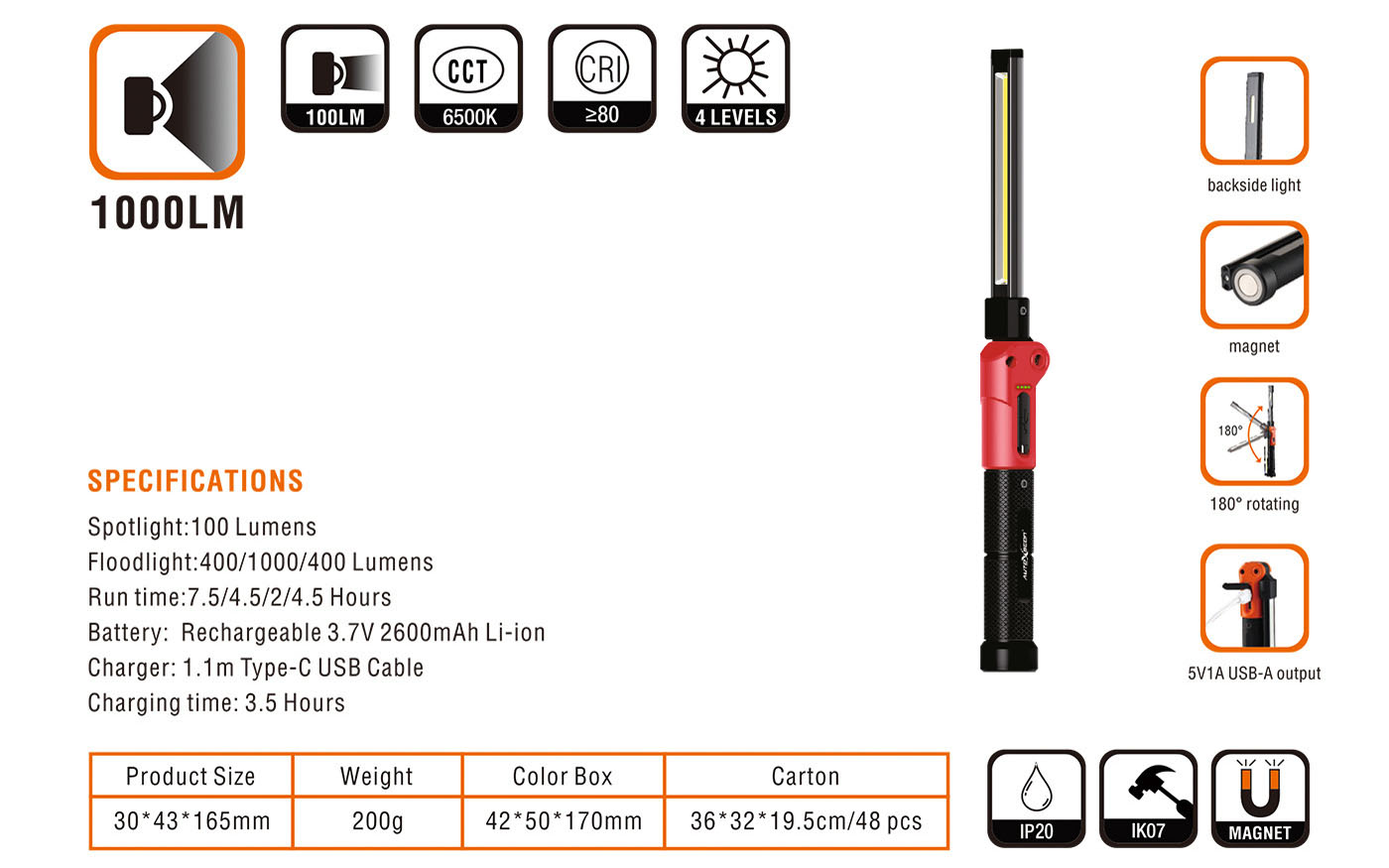 Mocna, niezawodna i wielofunkcyjna latarka o mocy 1000 Lumenów z cztero stopniową regulacją jasności, wbudowanym akumulatorem, magnesem i 180 stopniowa regulacją. Certyfikaty IP20 oraz IK07.